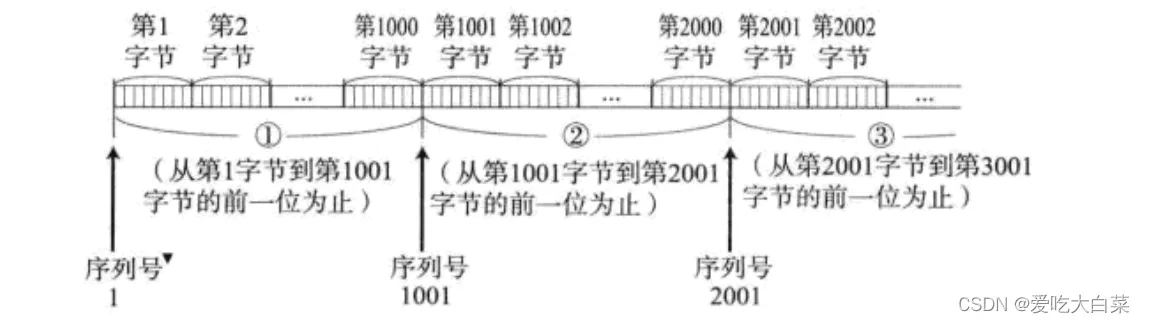 在TCP中并没有一条消息、两条消息的概念,上方的例子只是帮助理解才用了,TCP中的数据传输是面向字节流的,TCP会针对每一个字节进行编码,从前向后,把每一个字节分别配一个编号。