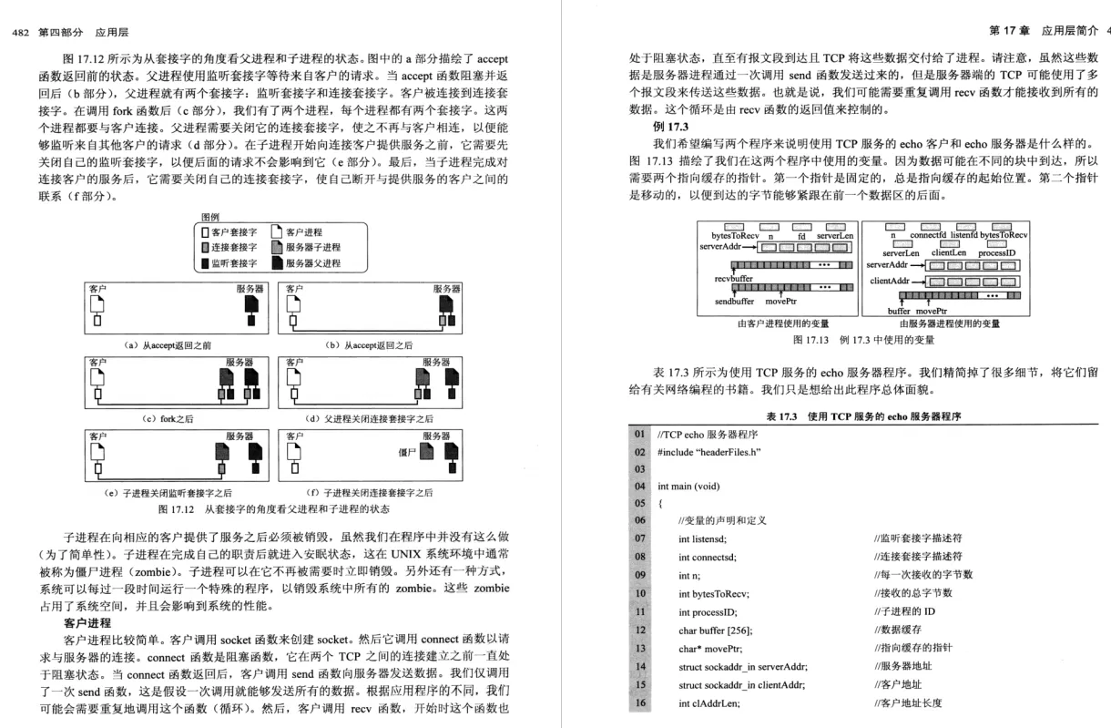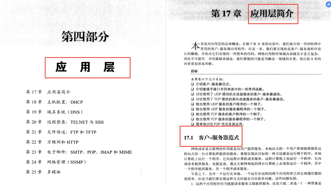 第四部分(应用层),包括第17~25章,介绍了应用层的总体概念,包括客户/