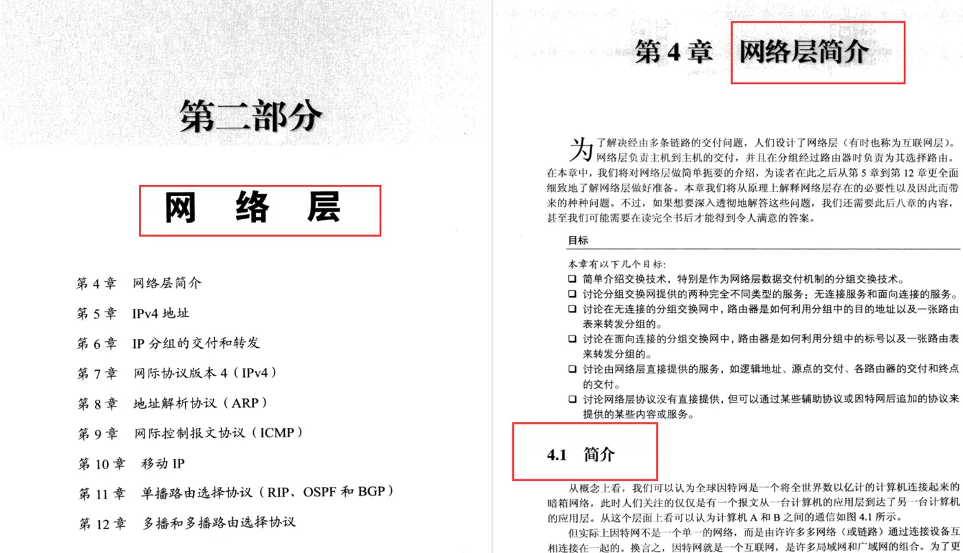第二部分(网络层),包括第4~12章,讨论了IPv4编址技术、IPv4协议、所有