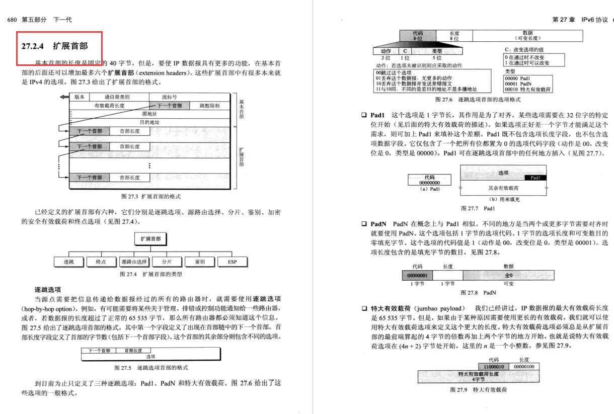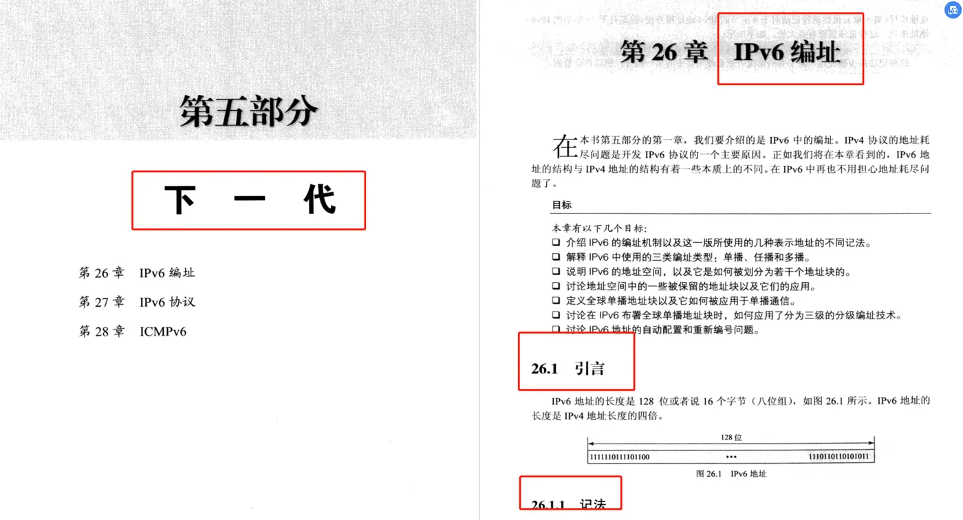 第五部分(新一代),包括第26~28章,介绍了新一代的IP协议、IPv6编址技术