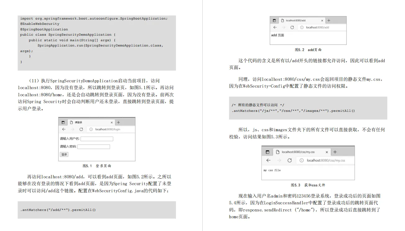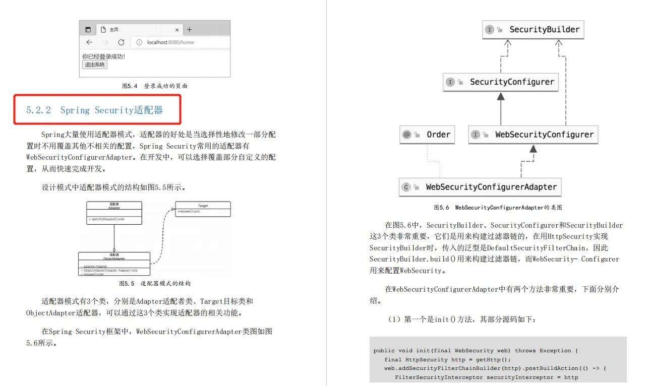 本章介绍了如何使用WebSecurityConf igurerAdapter适配器来配置项目的权限及用户授权信息,还介绍了Spr ing Security的核心类AuthenticationManager以及验证机制和验证流程,最后介绍了如何使用JPA和MyBatis完成一个简单的权限验证。