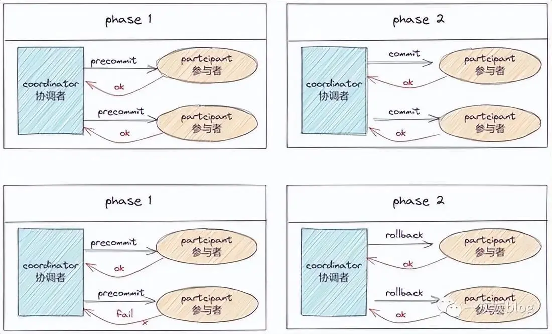 当第一个阶段,有一个参与者失败,则所有的参与者节点都回滚