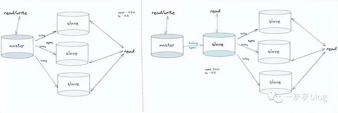 主从架构可以区分为:一主多从 + 一主一从再多从,以mysql的主从架构模型为例进行说明
