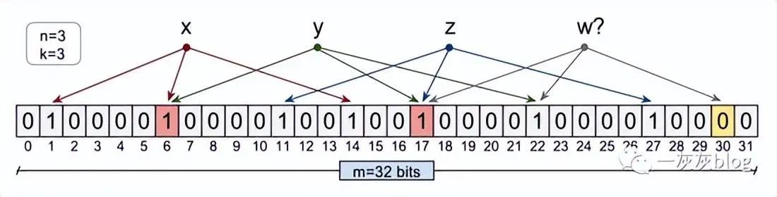 检索时,我们只要看看这些点是不是都是 1 就大约知道集合中有没有它了,也就是说,如果这些点有任何一个 0 ,则被检元素一定不在;如果都是 1 ,则被检元素很可能在。