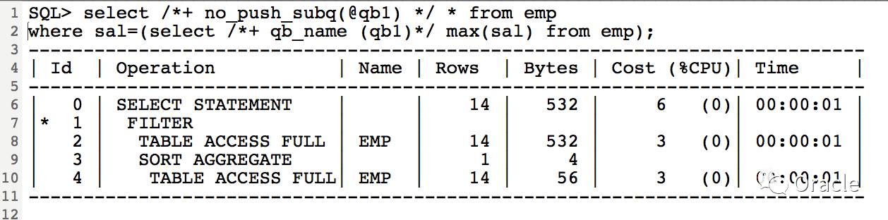 /*对比上面,对了一步FILTER。这里使用了嵌套循环,每一个EMP表的记录,都对应一次子查询的查询,获得MAX值*/