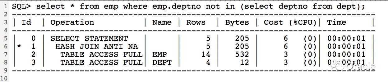 /*和NOT EXISTS类似,也选择了哈希连接,只不过是HASH JOIN ANTI NA。这里的NA,实际表示Null-Aware的意思,在11g及以后的版本中,Oracle增加了对空值敏感的反关联的支持*/