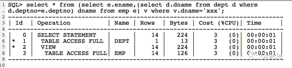 /*注意Id=3步骤的Start=3(emp表中的deptno有3个不同的值,这里就重复执行3次)。这体现了Cache技术,标量子查询中也有类似的Cache技术。*/