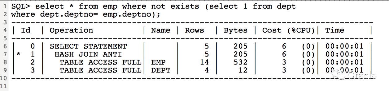 /*示例中的子查询引用表DEPT,最终转换为两个表的哈希半连接。也就是说,exists子句中的子查询被展开,其中的对象与主查询中的对象直接进行半关联操作*/