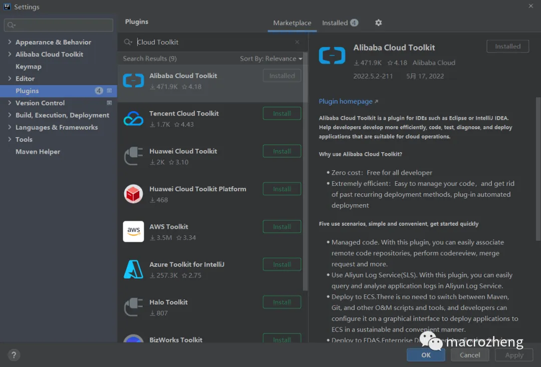 CloudToolkit的安装是非常简单的,直接在IDEA的插件市场中搜索Cloud Toolkit然后进行安装即可。