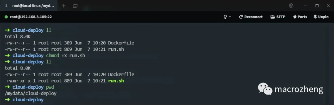 • 将这两个文件上传到Linux服务器上,给run.sh添加可执行权限;