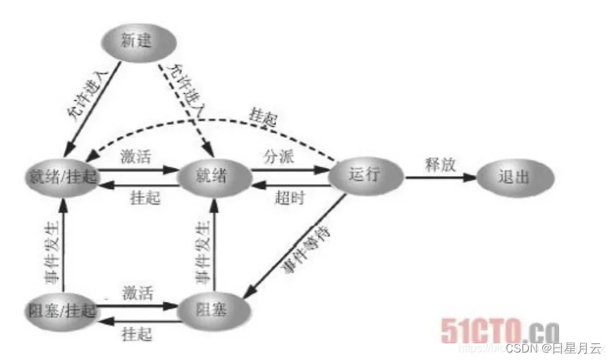 l 阻塞 → 阻塞/挂起:OS通常将阻塞进程换出,以腾出内存空间