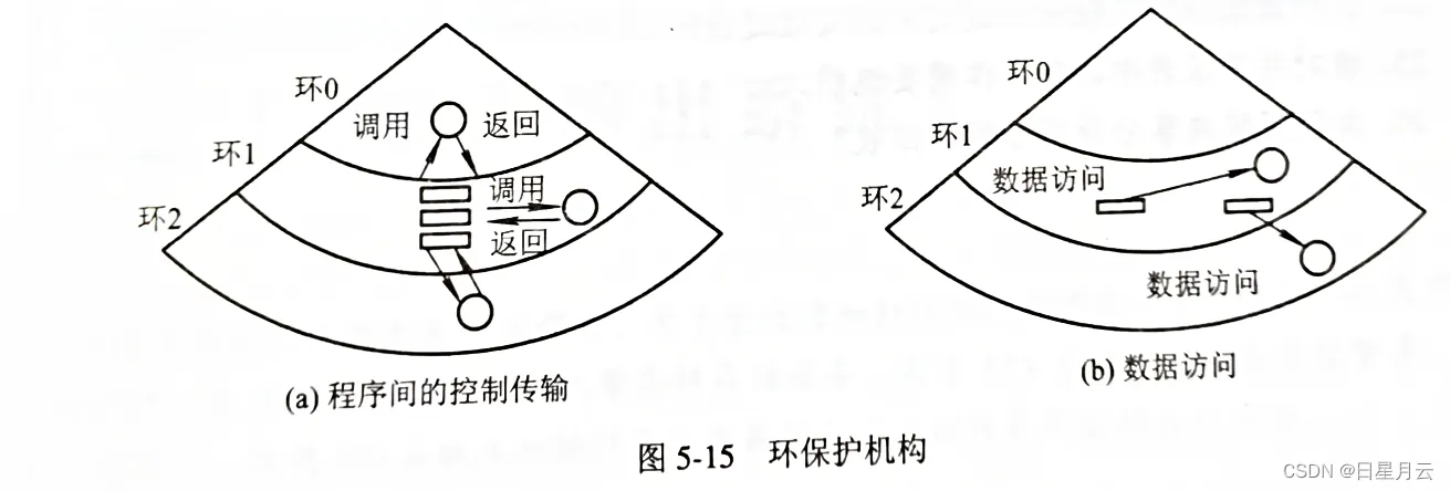 这是一种功能较完善的保护机制。在该机制中规定:低编号的环具有高优先权。OS 核心处于 0 环内;某些重要的实用程序和操作系统服务占居中间环;而一般的应用程序则被安排在外环上。在环系统中,程序的访问和调用应遵循以下规则: