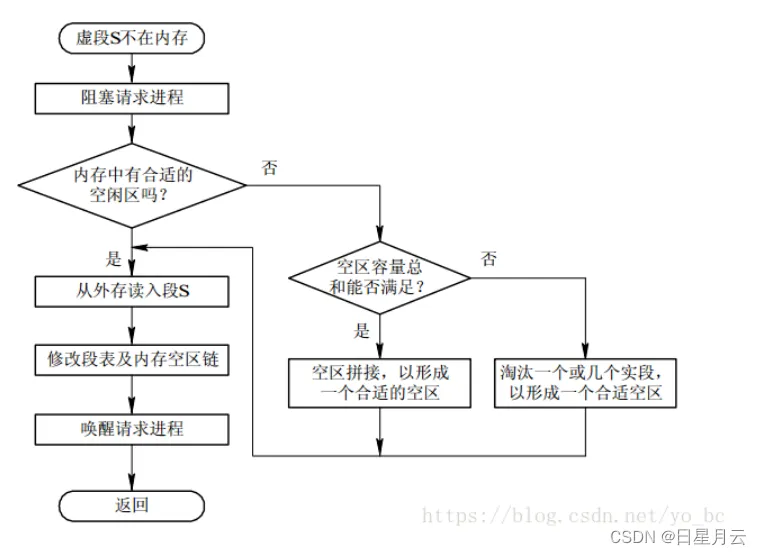 每当发现运行进程所要访问的段尚未调入内存时,便由缺段中断机构产生一缺段中断信号,进入 OS 后由缺段中断处理程序将所需的段调入内存。缺段中断机构与缺页中断机构类似,它同样需要在一条指令的执行期间,产生和处理中断,以及在一条指令执行期间,可能产生多次缺段中断。但由于分段是信息的逻辑单位,因而不可能出现一条指令被分割在两个分段中和一组信息被分割在两个分段中的情况。由于段不是定长的,这使对缺段中断的处理要比对缺页中断的处理复杂。