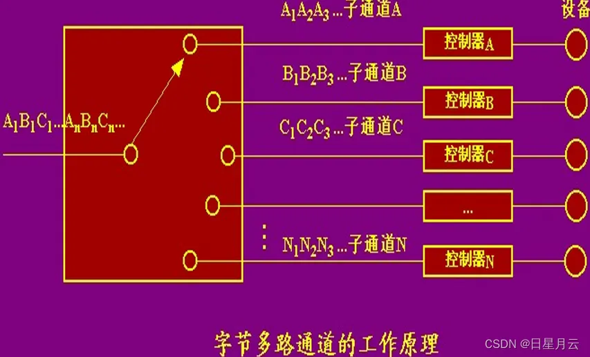 含有许多非分配型子通道(几十到几百), 每个子通道连结一台低速或中速字节设备, 子通道按时间片轮转方式共享主通道, 只要扫描一轮的速率足够快, 便不会丢失信息。