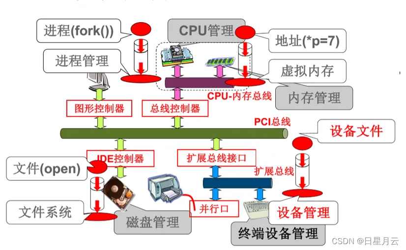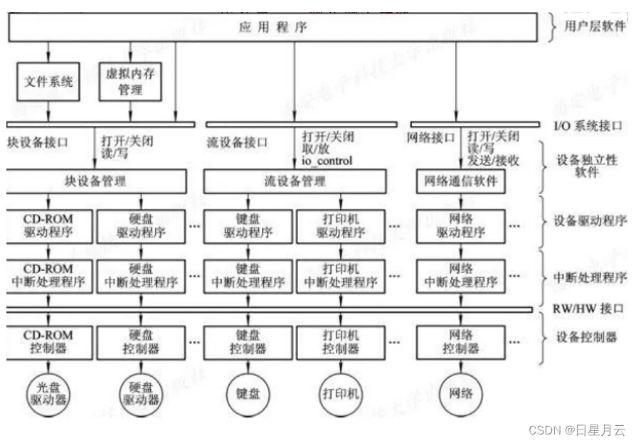 3)设备驱动程序。与硬件直接相关,用于具体实现系统对设备发出的操作指令,驱动 I/O 设备工作的驱动程序。