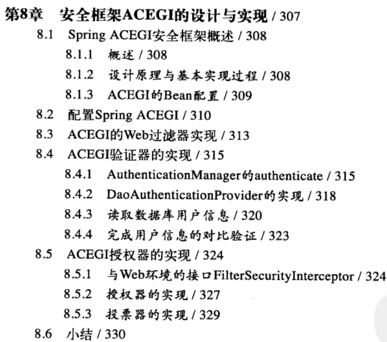 第三部分讲述了一些基于Spring的典型应用的实现。如果读者对在Spring应用中如何满足应用资源的安全性需求方面的内容感兴趣,可以阅读第8章,本章对为Spring应用提供安全服务的ACEGI框架的实现进行了分析,在深入了解这部分内容的基础上,读者可以根据自己的应用需求定制自己的安全系统。第9章分析了Spring DM的设计和实现,通过Spring DM,可以将Spring应用便利地架构到OSGi的框架.上去。第10章分析了Spring Flex的设计和实现,为使用Adobe Flex作为应用前端架构的Spring应用提供参考。