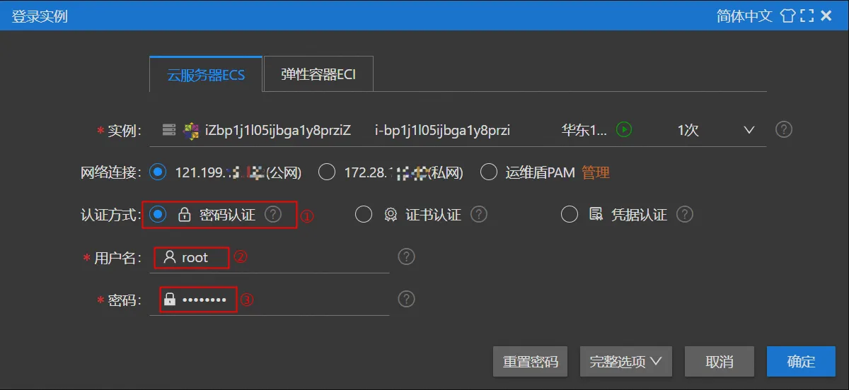 - 登录云服务器ECS,在Workbench页面中,通过密码认证方式,输入创建ECS实例时指定的用户名(root)和密码,点击确定,登录ECS。