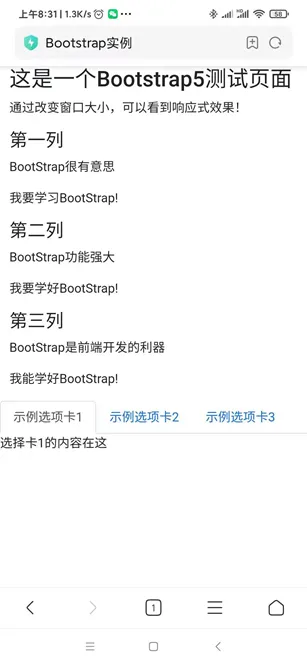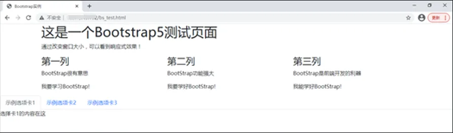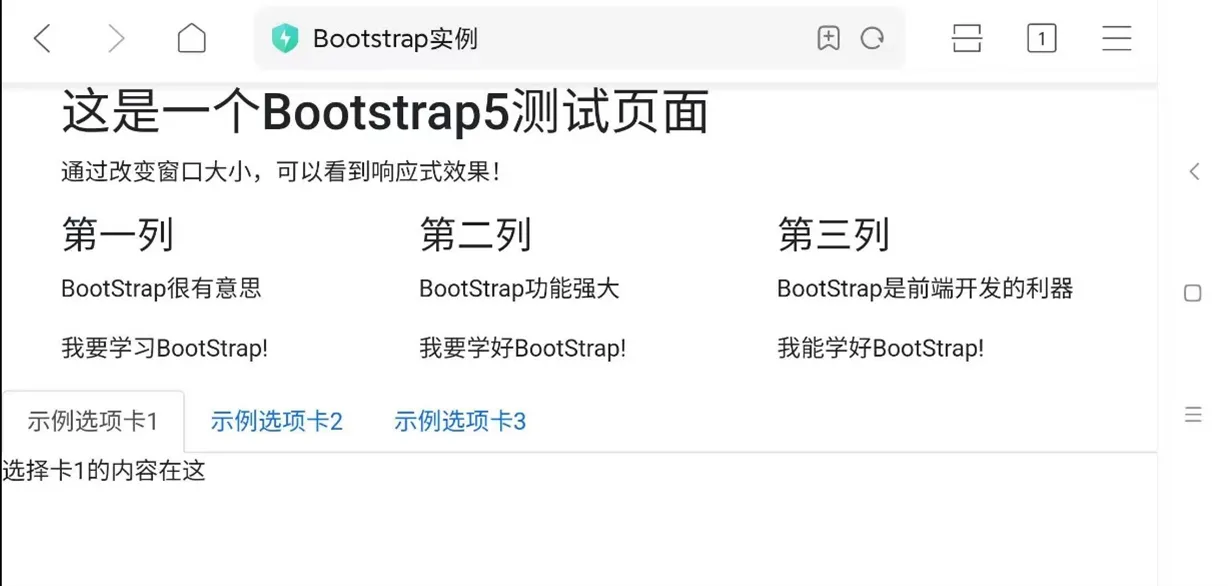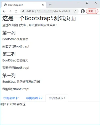 <!DOCTYPE html> <html> <head> <title>Bootstrap实例</title> <meta charset="utf-8"> <meta name="viewport" content="width=device-width, initial-scale=1"> <link rel="stylesheet"href="bootstrap-5.2.2-dist/css/bootstrap.min.css"> <script src="bootstrap-5.2.2-dist/js/bootstrap.min.js"></script> </head> <body> <div class="container"> <div> <h1>这是一个Bootstrap5测试页面</h1> <p>通过改变窗口大小,可以看到响应式效果!</p> </div> <div class="row"> <div class="col-sm-4"> <h3>第一列</h3> <p>BootStrap很有意思</p> <p>我要学习BootStrap!</p> </div> <div class="col-sm-4"> <h3>第二列</h3> <p>BootStrap功能强大</p> <p>我要学好BootStrap!</p> </div> <div class="col-sm-4"> <h3>第三列</h3> <p>BootStrap是前端开发的利器</p> <p>我能学好BootStrap!</p> </div> </div> </div> <ul class="nav nav-tabs"> <li class="nav-item"> <a class="nav-link active" data-bs-toggle="tab" href="#home">示例选项卡1</a></li> <li class="nav-item"> <a class="nav-link" data-bs-toggle="tab" href="#profile">示例选项卡2</a></li> <li class="nav-item"> <a class="nav-link" data-bs-toggle="tab" href="#contact">示例选项卡3</a></li></ul> <div class="tab-content"> <div class="tab-pane fade show active" id="home">选择卡1的内容在这</div> <div class="tab-pane fade" id="profile">选择卡2的内容在这</div> <div class="tab-pane fade" id="contact">选择卡3的内容在这</div></div> </body> </html>
