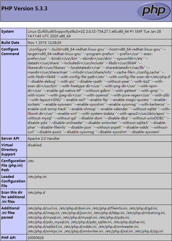 d. 打开浏览器,访问http://<ECS公网IP>/phpinfo.php,显示如下页面表示PHP安装成功。
