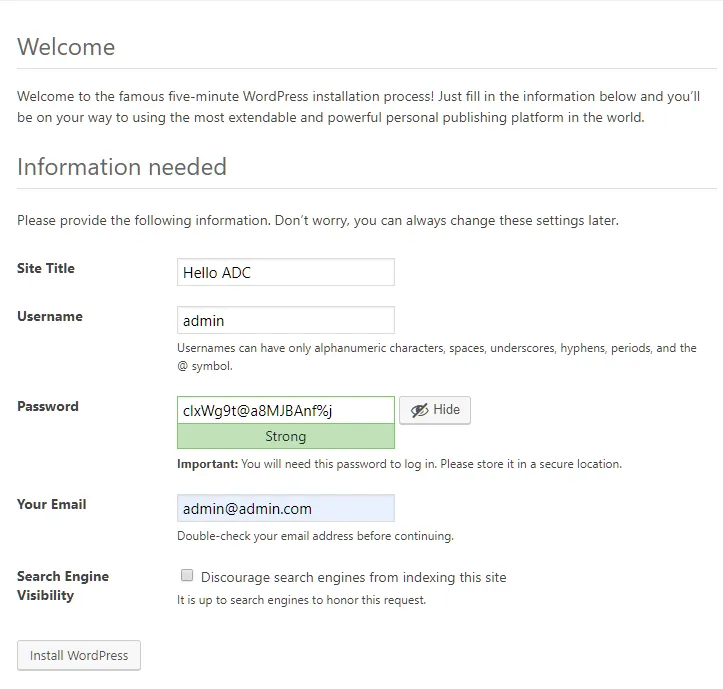 2. 设置您的站点名称、管理员用户名和密码,然后单击 【Install WordPress】 完成WordPress初始化。