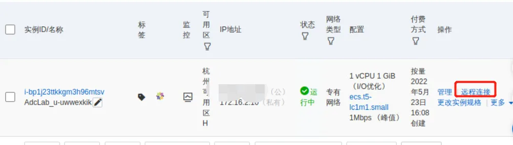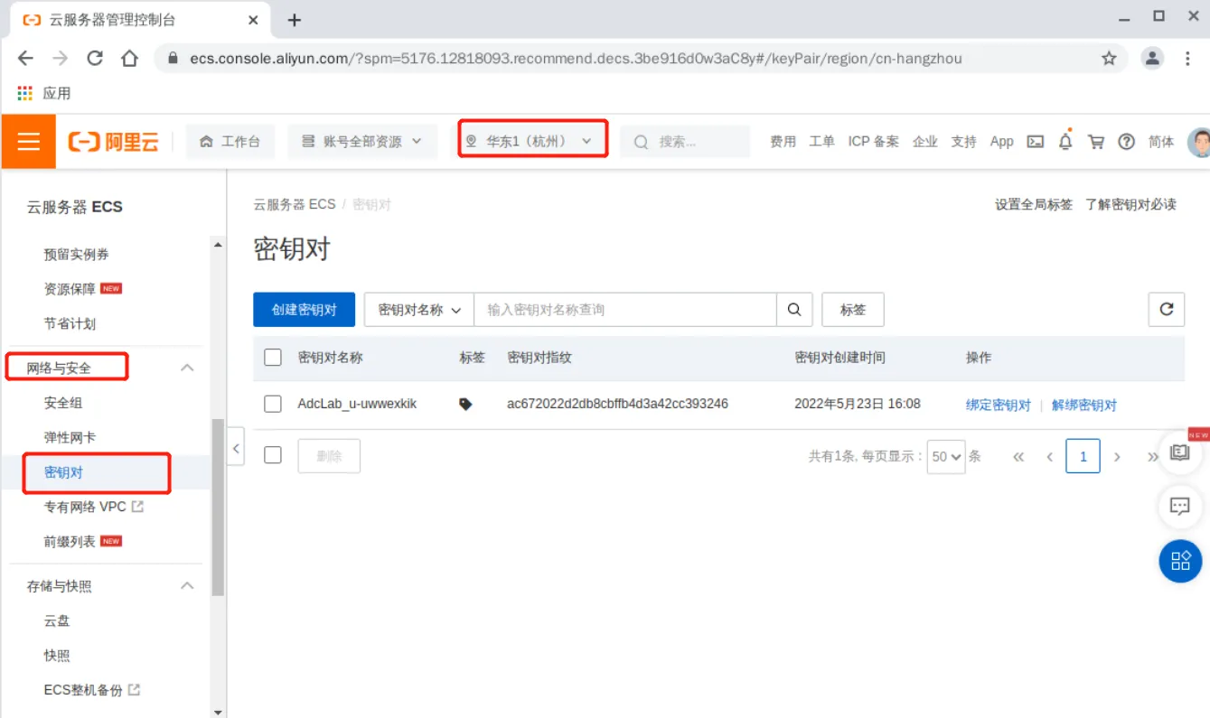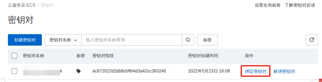 4)找到需要操作的密钥对,在操作列中找到实验资源所提供的密钥对,单击绑定密钥对。