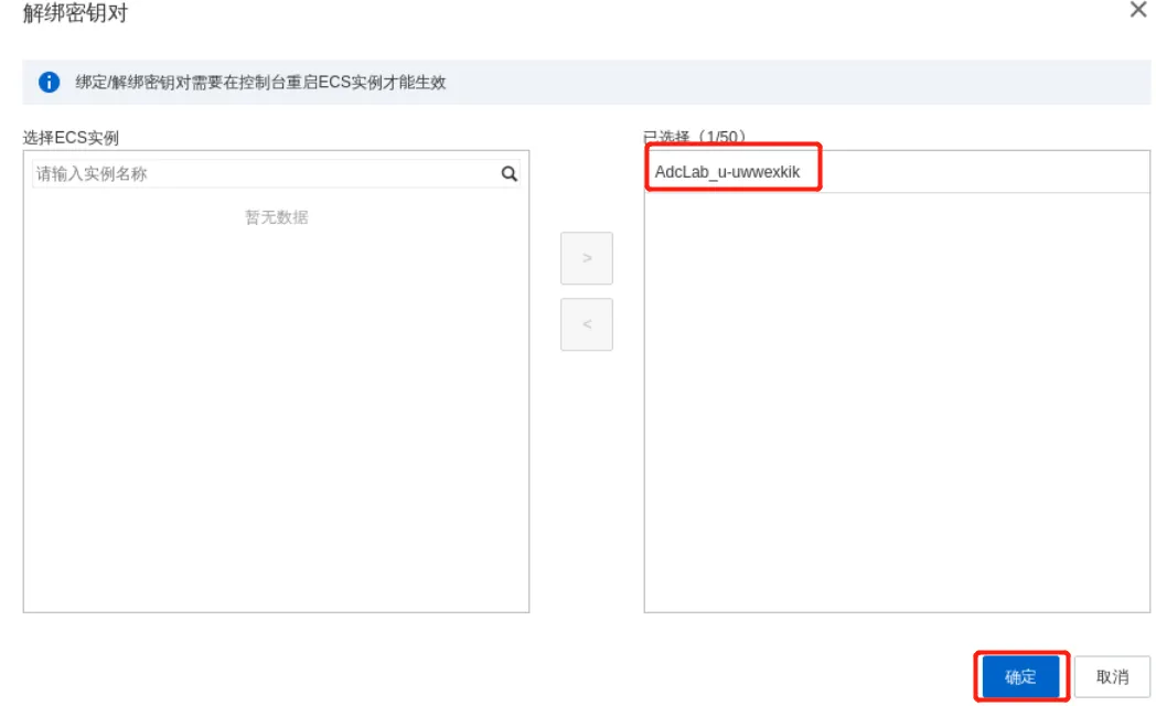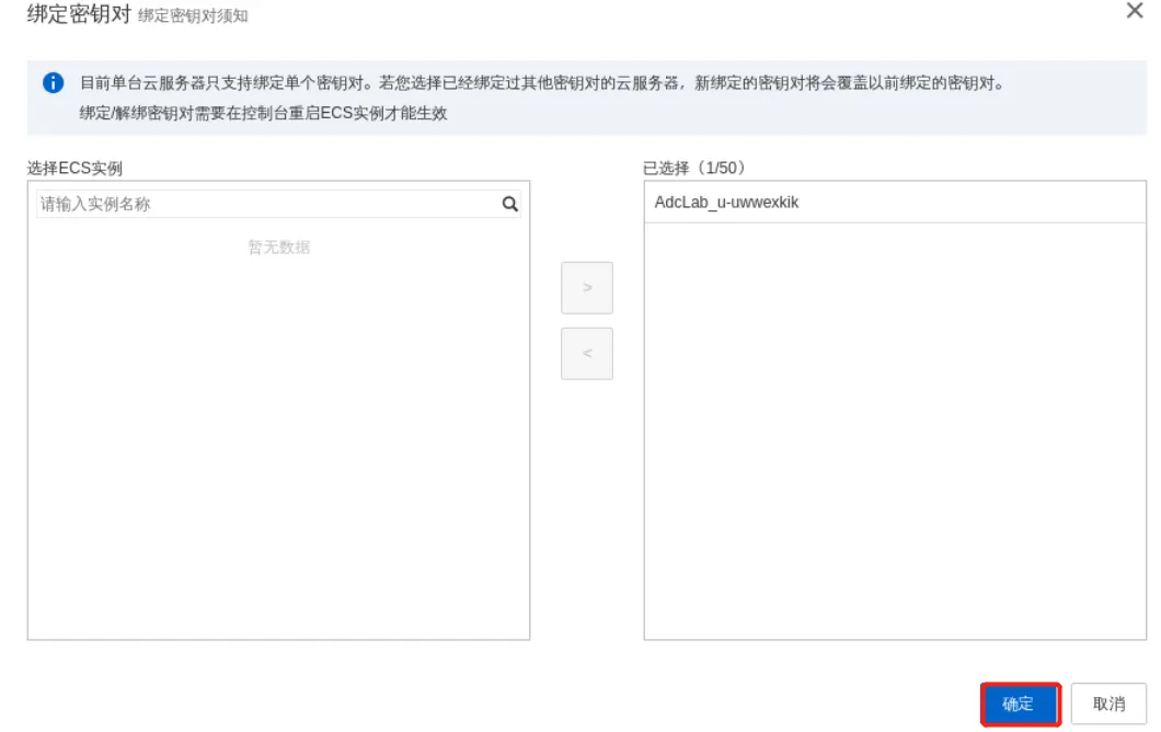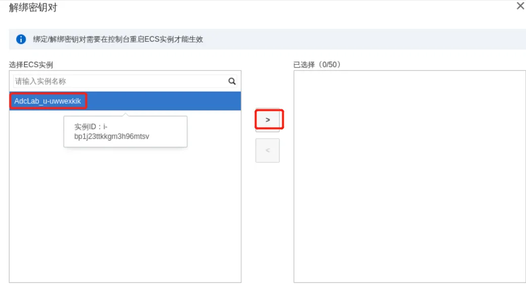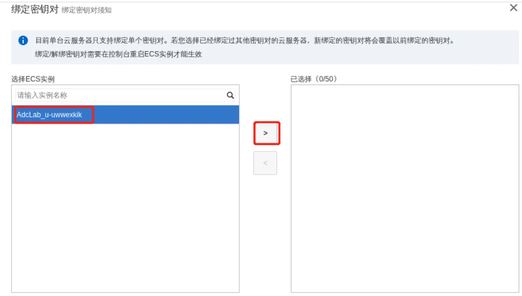 5)在选择ECS实例栏中,选中需要绑定该密钥对的ECS实例名称,单击>图标,移入已选择栏中。