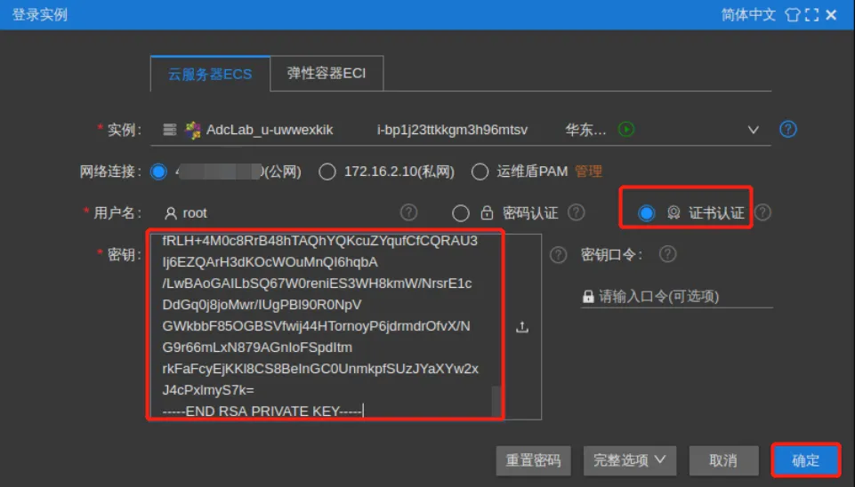 ECS重启后,远程连接ECS,需通过证书认证,将实验资源提供的密钥复制粘贴到密钥框进行登录