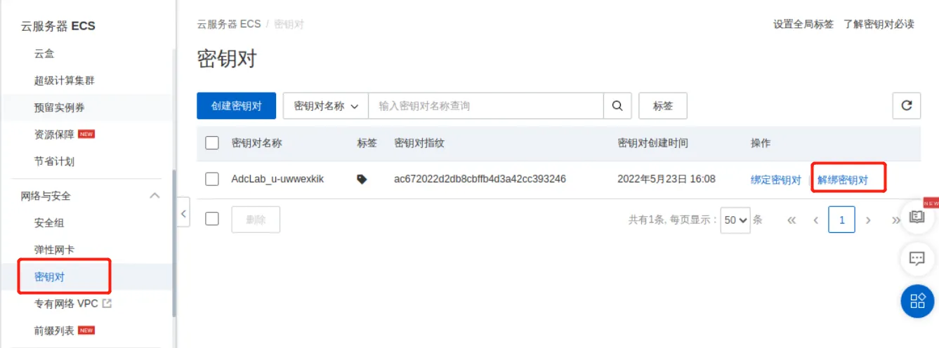 4)找到需要操作的密钥对,在操作列中,单击解绑密钥对。