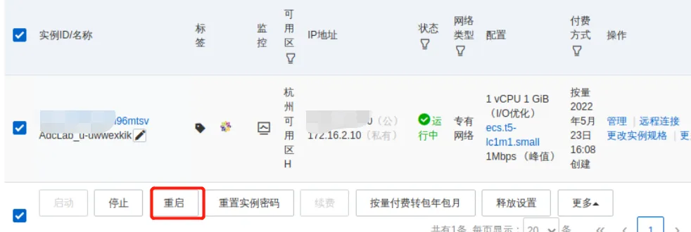 7)如果ECS实例处于运行中(Running)状态,重启实例使操作生效: