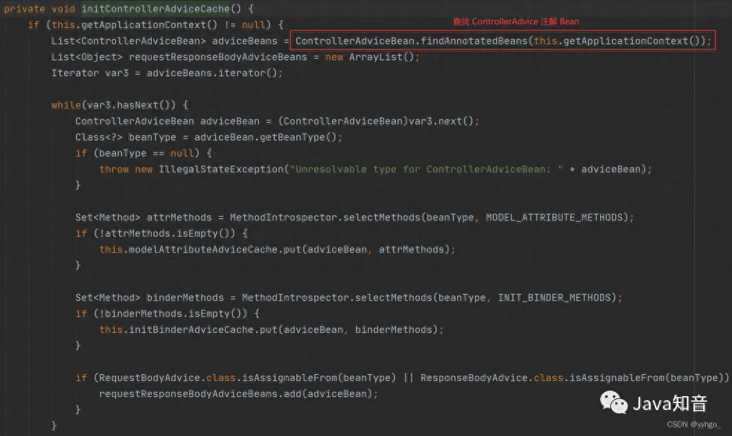 ⽽这个⽅法中有⼀个 initControllerAdviceCache ⽅法,查询此⽅法的源码如下: