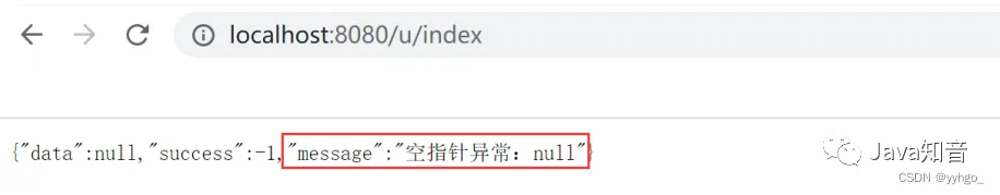 @RestController @RequestMapping("/u") public class UserController { @RequestMapping("/index") public String index() { Object obj = null; int i = obj.hashCode(); return "Hello,User Index."; } }