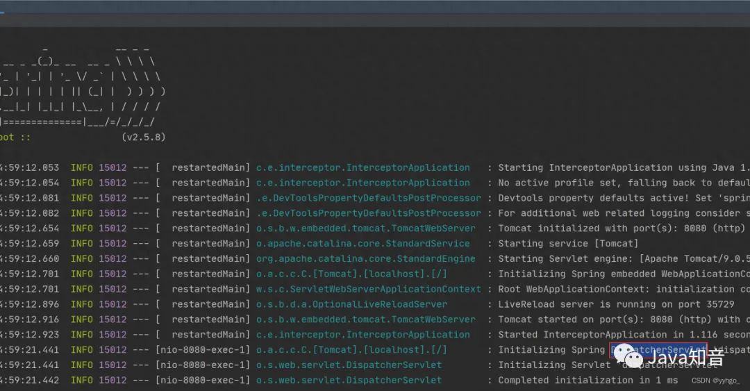 所有的 Controller 执⾏都会通过⼀个调度器 DispatcherServlet 来实现,这⼀点可以从 Spring Boot 控制台的打印信息看出,如下图所示: