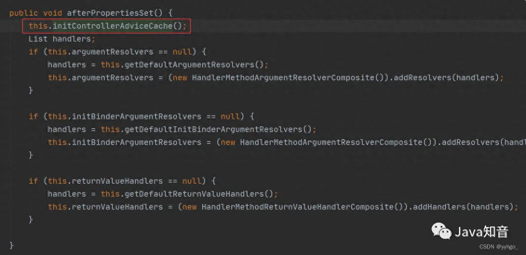 RequestMappingHandlerAdapter,它⾥⾯有⼀个⽅法 afterPropertiesSet() ⽅法,表示所有的参数设置完成之后执⾏的⽅法,如下图所示: