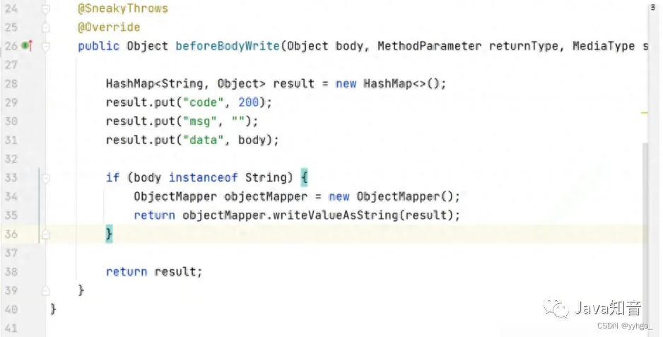 import org.springframework.core.MethodParameter; import org.springframework.http.MediaType; import org.springframework.http.server.ServerHttpRequest; import org.springframework.http.server.ServerHttpResponse; import org.springframework.web.bind.annotation.ControllerAdvice; import org.springframework.web.servlet.mvc.method.annotation.ResponseBodyA dvice; import java.util.HashMap; /** * 统一返回数据的处理 */ @ControllerAdvice public class ResponseAdvice implements ResponseBodyAdvice { /** * 内容是否需要重写(通过此⽅法可以选择性部分控制器和⽅法进⾏重写) * 返回 true 表示重写 */ @Override public boolean supports(MethodParameter returnType, Class converterTyp e) { return true; } /** * ⽅法返回之前调⽤此⽅法 */ @Override public Object beforeBodyWrite(Object body, MethodParameter returnType, MediaType selectedContentType, Class selectedConverterType, ServerHttpR equest request, ServerHttpResponse response) { // 构造统⼀返回对象 HashMap<String, Object> result = new HashMap<>(); result.put("state", 1); result.put("msg", ""); result.put("data", body); return result; } }