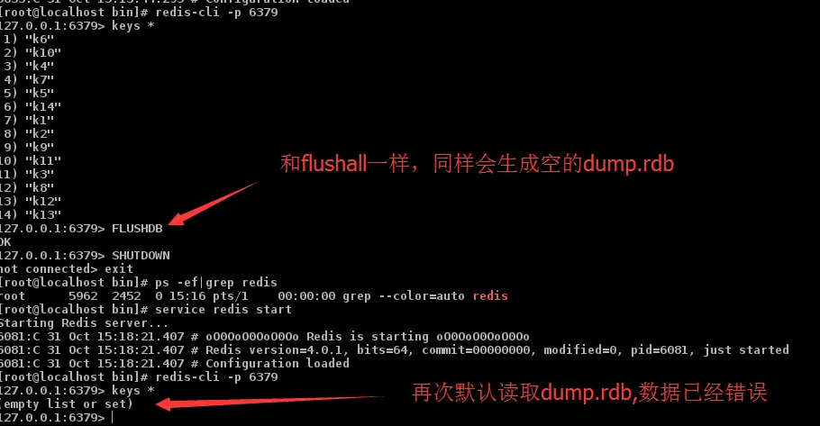 需要注意的是FLUSHDB FLUSHALL同样会生成dump.rdb文件,只是该文件为数据错误文件(前者清除了当前库,后者清除了所有库)。