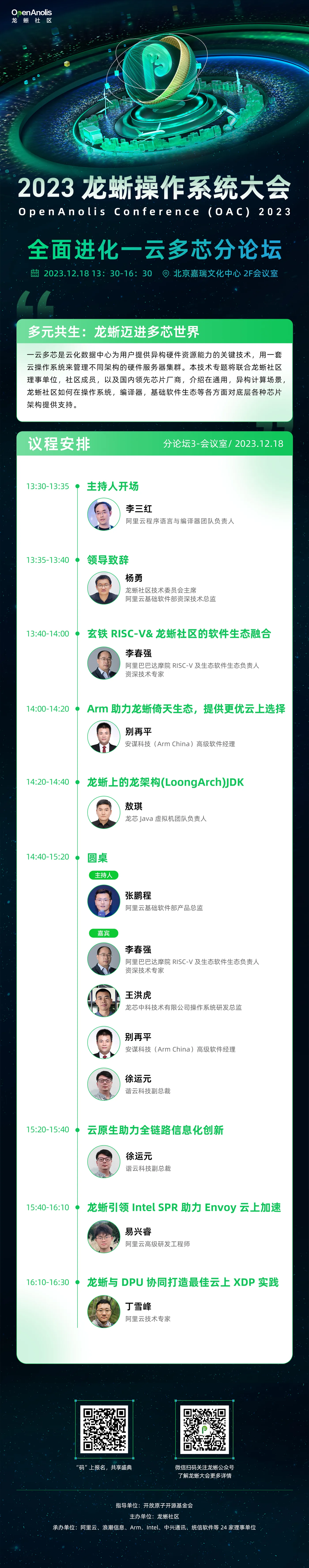 一云多芯是云化数据中心为用户提供异构硬件资源能力的关键技术,用一套云操作系统来管理不同架构的硬件服务器集群。全面进化一云多芯分论坛将联合龙蜥社区理事单位,社区成员,以及国内领先芯片厂商,介绍在通用、异构计算场景,龙蜥社区如何在操作系统、编译器、基础软件生态等各方面对底层各种芯片架构提供支持。