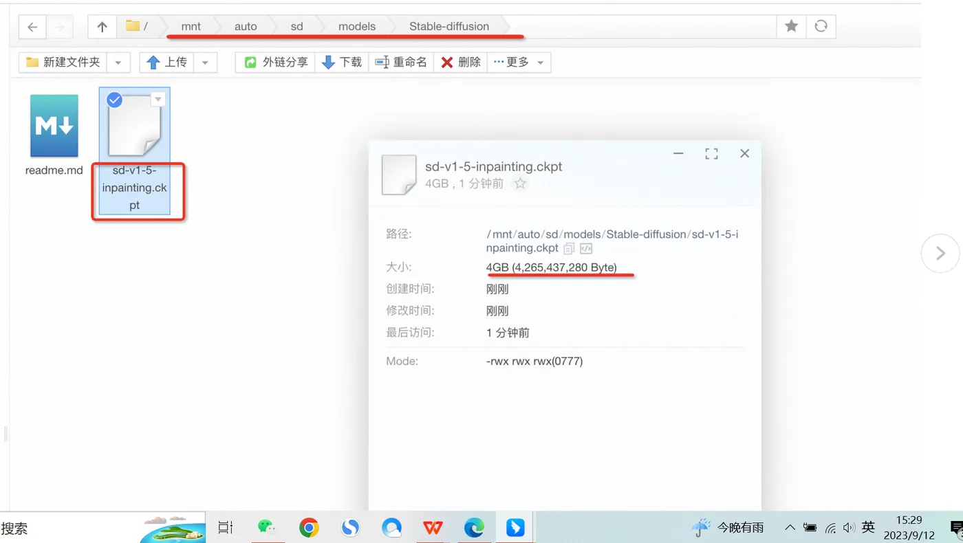 如果您将模型上传后打开Stable Diffusion服务中没有上传的模型或同原因一启动超时,请检查上传的模型后缀是否正确,模型后缀要求为 .ckpt 结尾。在 KodBox 中下载完的模型地址后缀为 txt,您需要手动修改为 ckpt。