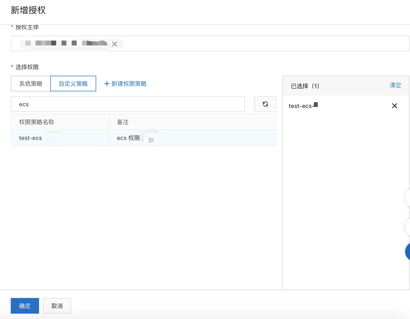 - 点击 权限管理>新增权限>自定义策略,在搜索框中输入上面定义的权限名,添加到用户即可