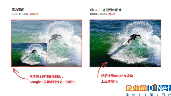 Google发布RAISR技术不久前,Google刚刚发布了一种名为RAISR(Rapid and Accurate Super Image Resolution,意为“快速、精确的超级图像分辨率技术”)的图像压缩技术,旨在保存宝贵的数据,而不牺牲照片质量;并在带宽受限的移动设备上提供清晰锐利的图像。