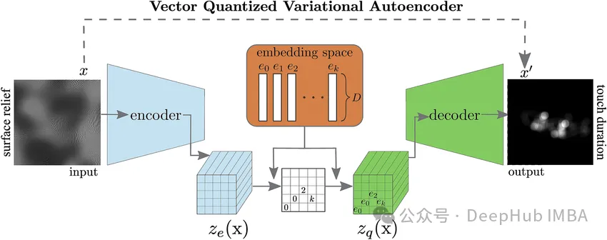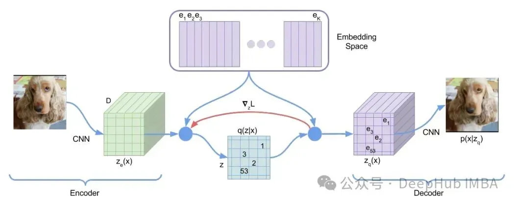 首先,编码器生成嵌入。然后从码本中为给定嵌入选择最佳近似。码本由离散向量组成。使用L2距离进行最近邻查找。