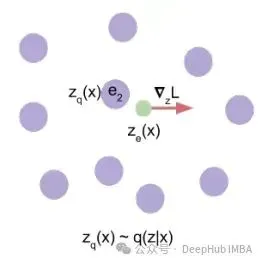 在训练过程中,梯度可以推动编码器嵌入(绿色圆圈)靠近不同的离散表示(紫色圆圈)。