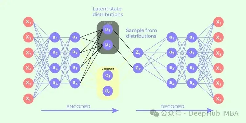 标准的自编码器将输入映射到潜在空间中的单个点。然而,VAE的编码器输出概率分布的参数(均值和方差)。模型从这个分布中采样一个点,然后将其输入到解码器中。