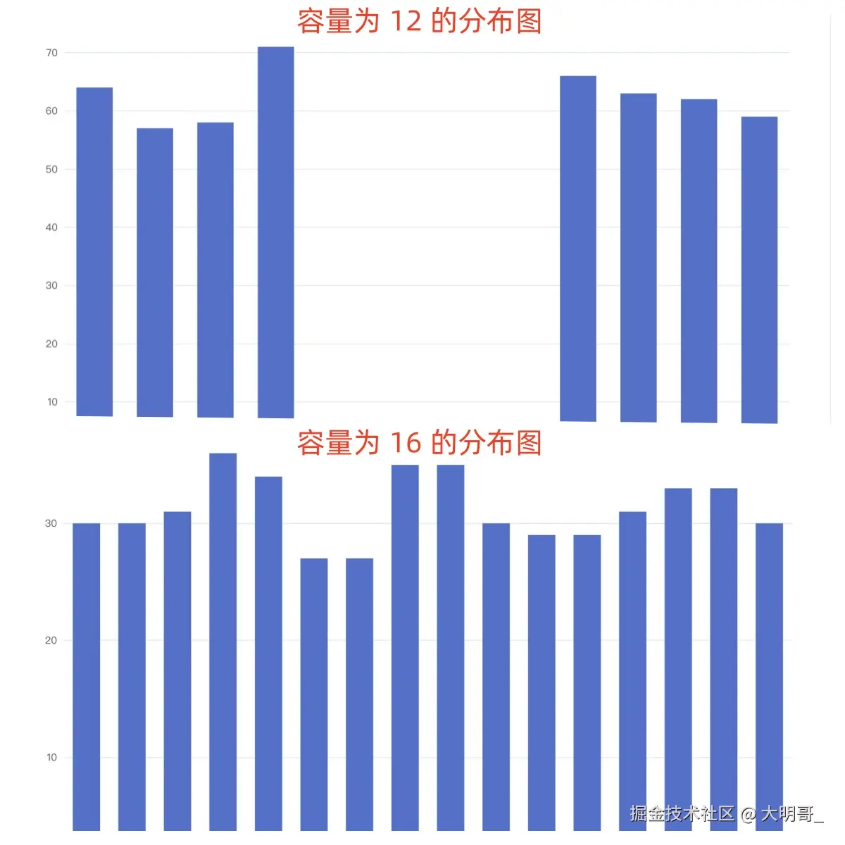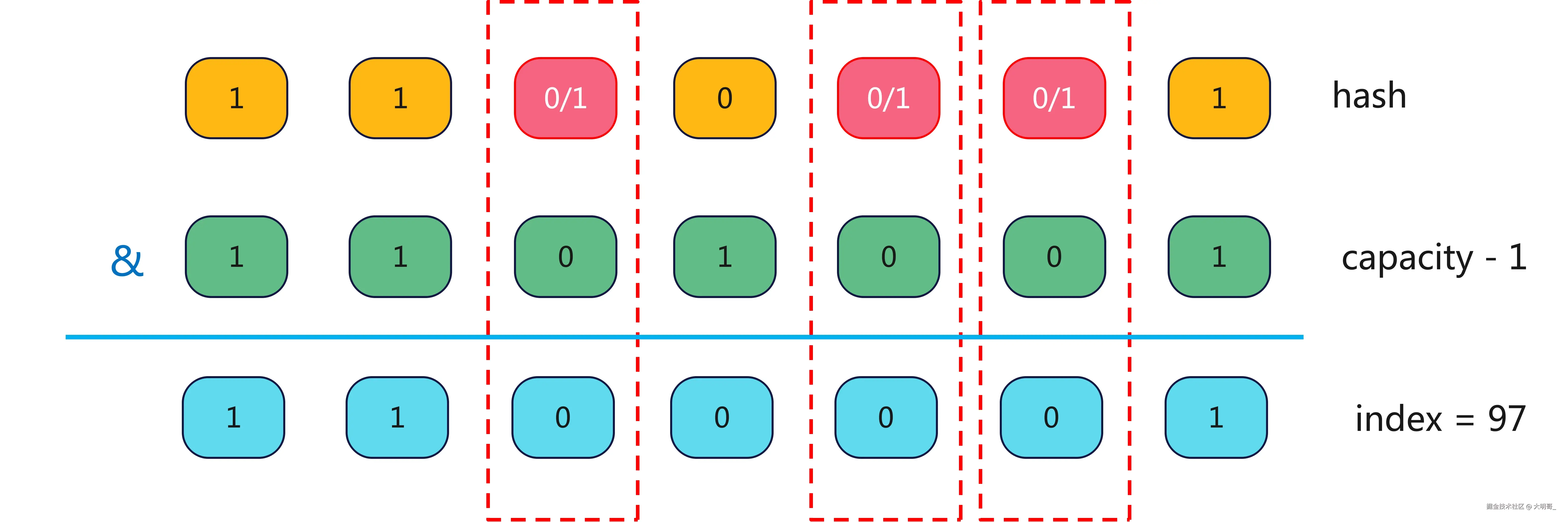 2^n时,计算索引的公式可以从(hash % capacity)简化为(hash & (capacity - 1)),这个操作仅涉及位与运算,比取模操作更快。 - 元素分布更加均匀:利用哈希码的低位直接作为数组索引,确保了元素能够被均匀分布在整个