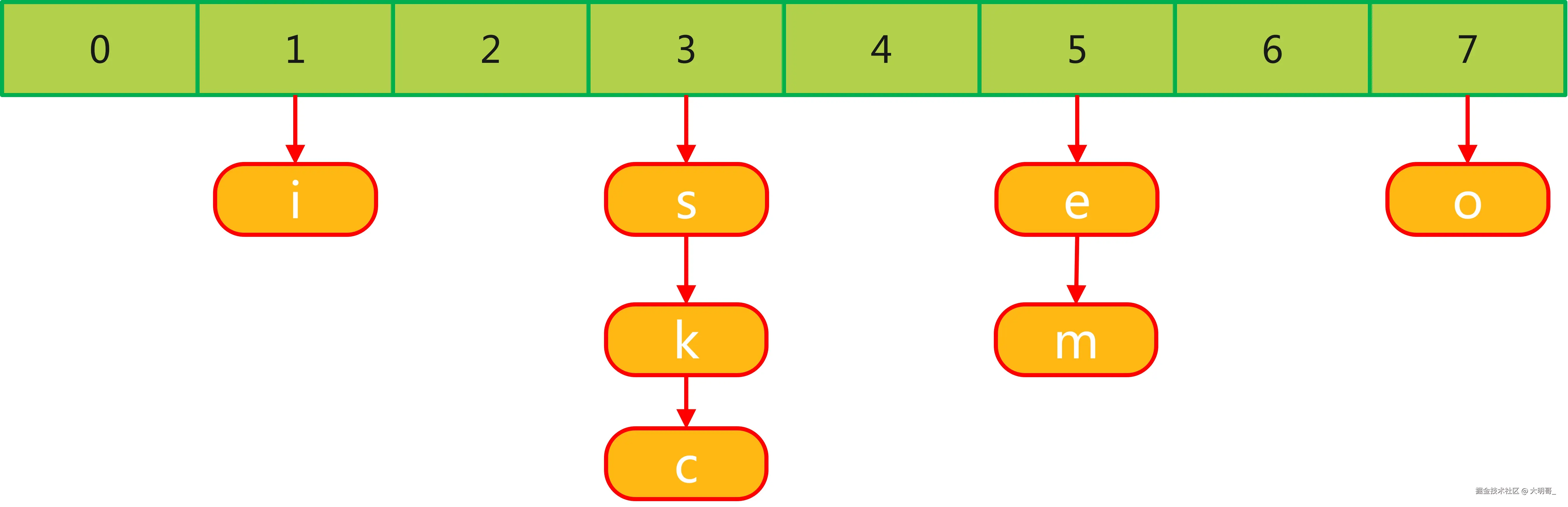 加入我们有这样一批 key:s、i、k、e、c、o、m,为了更好地演示,HashMap 的初始容量为8,所以数据分布如下: