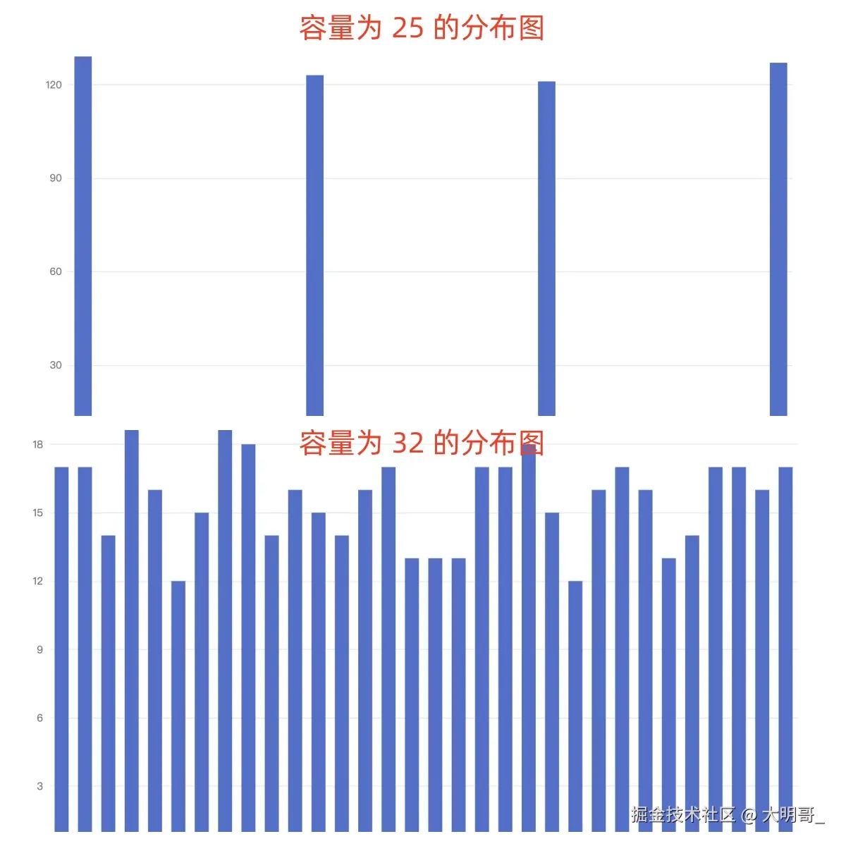 你会发现标红色虚线部分,无论是 0 还是 1 产生的结果都是一样的,所以如果 capacity 为 106,则它产生的 hash 冲突比 127 大的多。