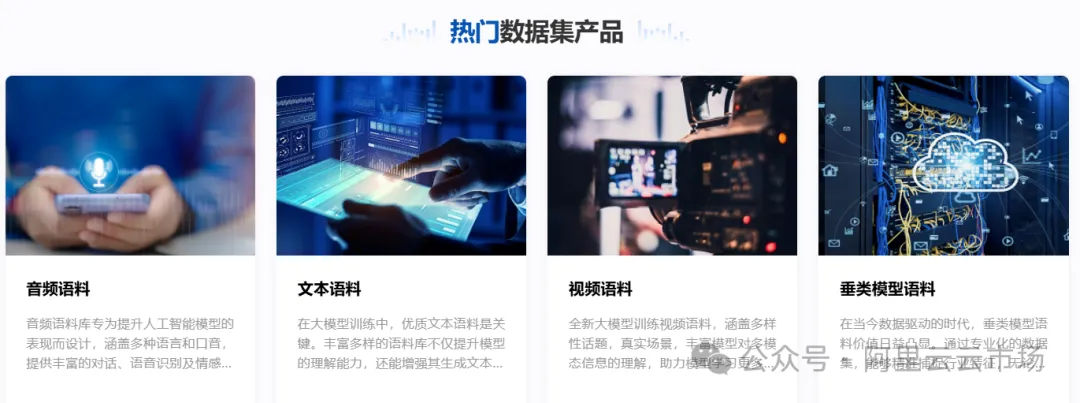 “数智产业链-阿里云云市场专区” ,云市场作为阿里云开放的数字化产品交易平台,全面服务数据要素生态,为数据提供者、开发者、使用者等各方提供了交易、交流、合作的场所。对于数据使用者,可快速查找所需数据,用于AI及大模型训练、数据分析、应用程序开发等;对于数据提供者,可简化数据发布、定价、交付、授权等流程,降低技术门槛和操作成本。目前成品数据集类型主要包含模型预训练类、生活类、教育类、语音类、自动驾驶五大类别。