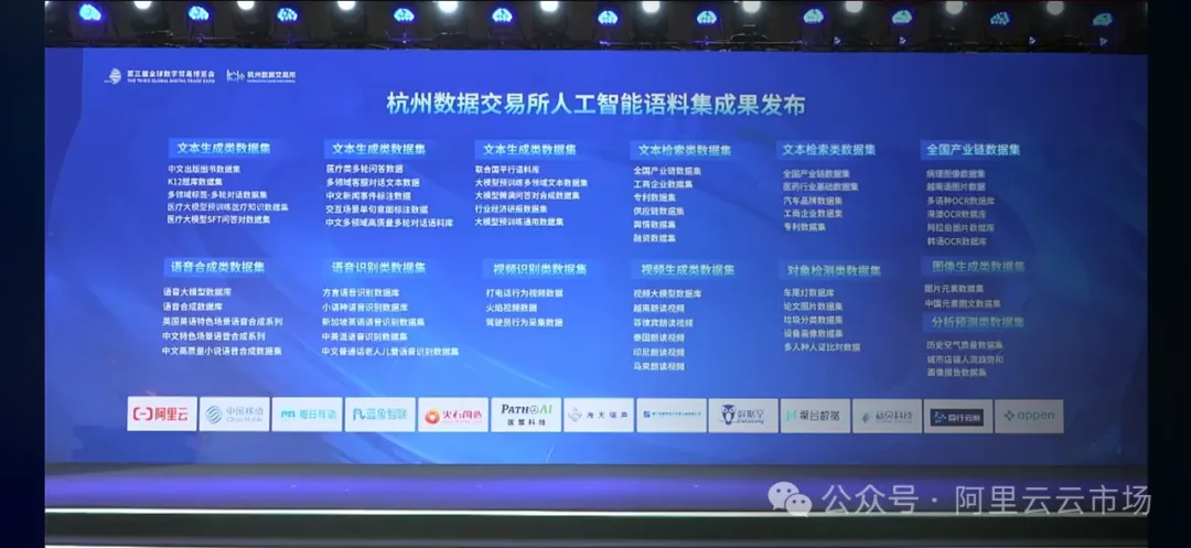 在9月25日的第三届全球数字贸易博览会期间,作为主题活动之一的数据要素治理与市场化交流会,重磅发布了“中国数谷”高质量发展系列成果。其中,云市场与杭州数据交易所联合推出的人工智能训练语料数据集,涵盖了来自标贝科技、百行云游、数据堂、澳鹏和聚合数据等合作伙伴的10多种数据集,充分展示了数字经济的创新与合作潜力。