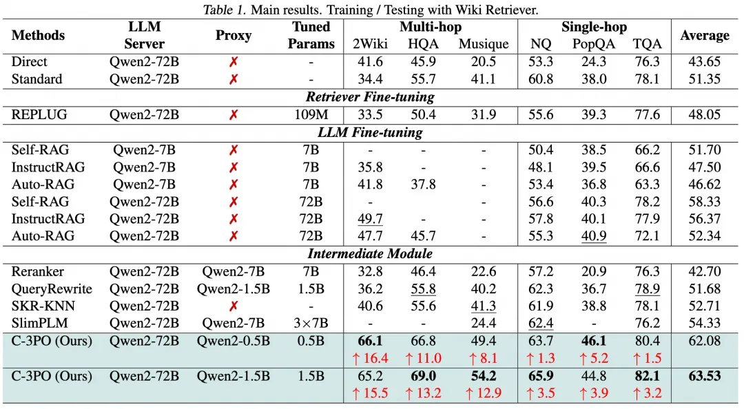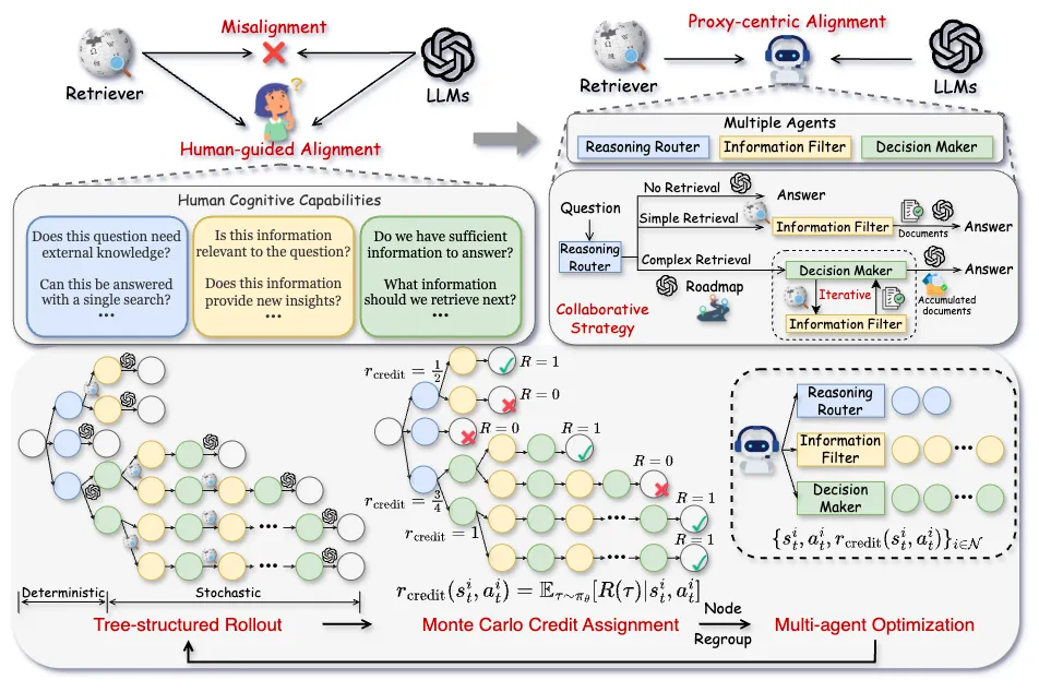 该工作提出了C-3PO,一个以代理为中心的对齐框架,它通过轻量级多智能体系统促进检索器和 LLM之间的通信。C-3PO通过利用多智能体强化学习、树状结构的Rollout和蒙特卡洛信用分配机制,端到端地优化了多个智能体,而无需修改现有的 RAG 组件。大量实验证明了C-3PO在不同的数据集、检索器和 LLM 上展现出卓越性能和强大的泛化能力。