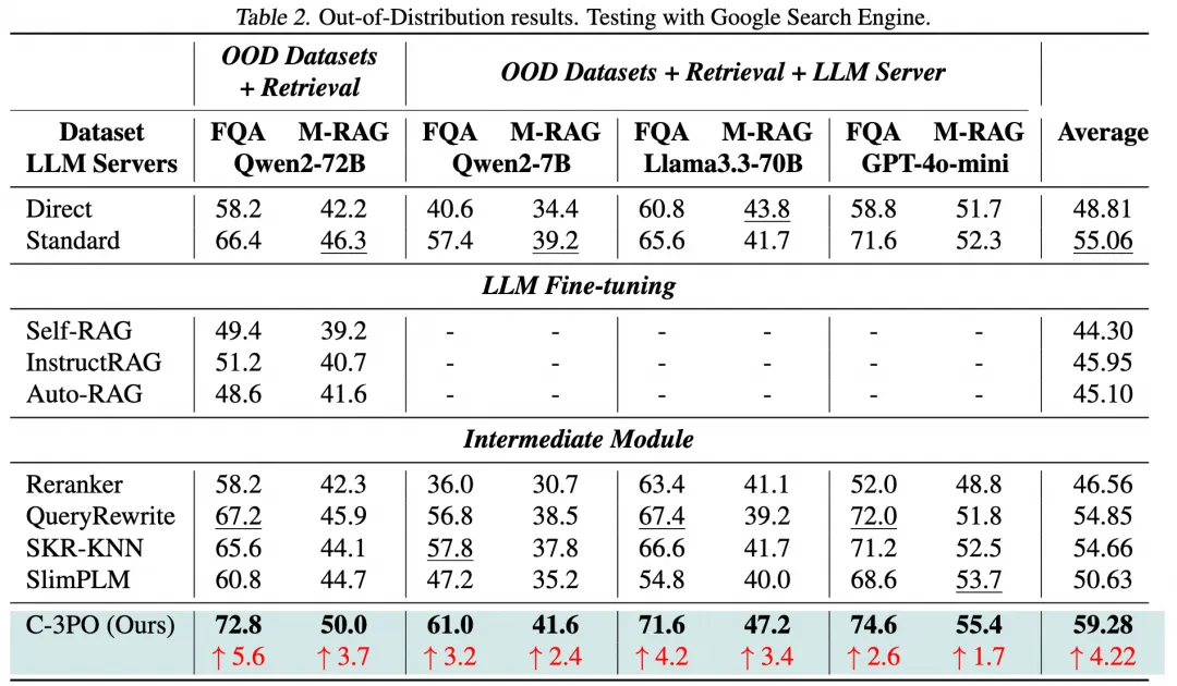 该工作从各个角度全面评估了C-3PO的性能,包括域内的单跳、多跳数据集(图2),域外最新的RAG评测数据集以及域外检索器和大模型上的性能(图3)。总体而言,仅优化少量参数(0.5B-1.5B)的情况下,C-3PO在各种单跳和多跳数据集上表现出出色的性能。而在各种域外设定下,C-3PO取得了非常鲁棒的结果,展现出其即插即用的特点。
