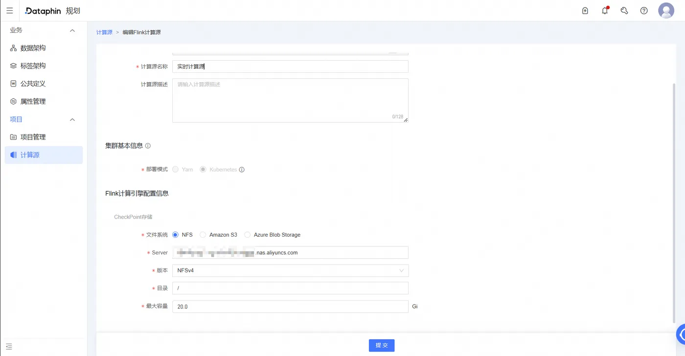 1、配置Flink计算源,部署模式选择Kubernetes,填写NFS的信息